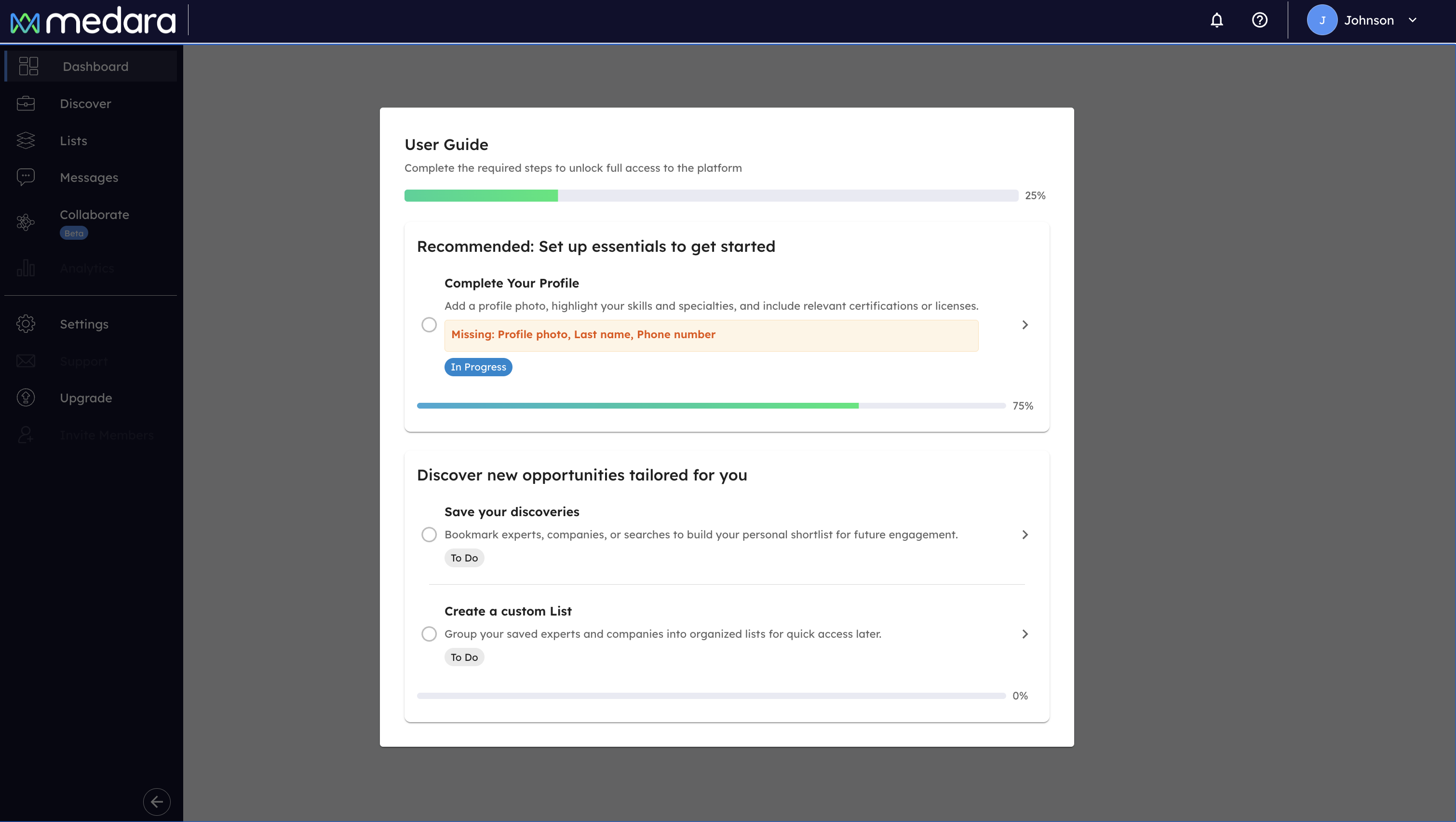 After onboarding, Medara will guide you through recommended setup tasks such as:
